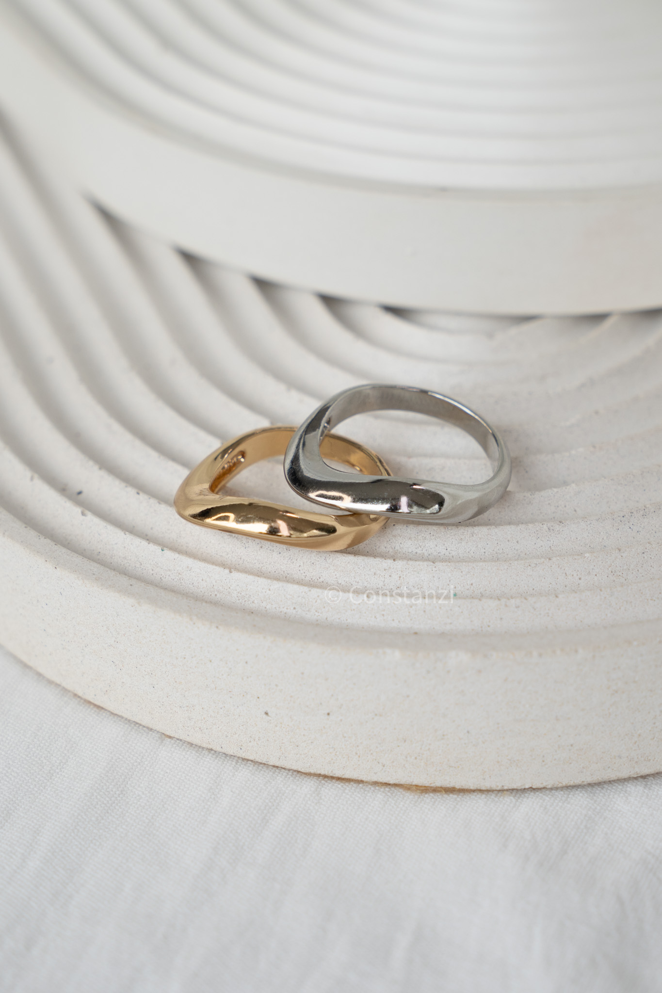 O Anel Doble é composto por 2 Anéis com design orgânico sendo um com Banho em Ouro 18K e outro com Banho em Ródio 18k. Ambos os Anéis tem o Tamanho 22. Pode ser utilizado em par ou como único anel bem como combinado com outros anéis, formando um mix para valorizar sua produção.