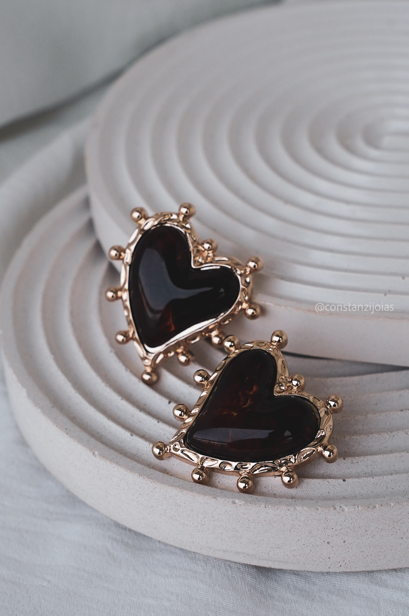 O Brinco Coração Tartaruga combina charme romântico com um toque moderno e natural. Sua borda dourada com detalhes orgânicos envolve um interior em resina marmorizada marrom translúcida, criando nuances únicas que lembram o clássico efeito tartaruga. O resultado é uma peça sofisticada, versátil e cheia de personalidade.