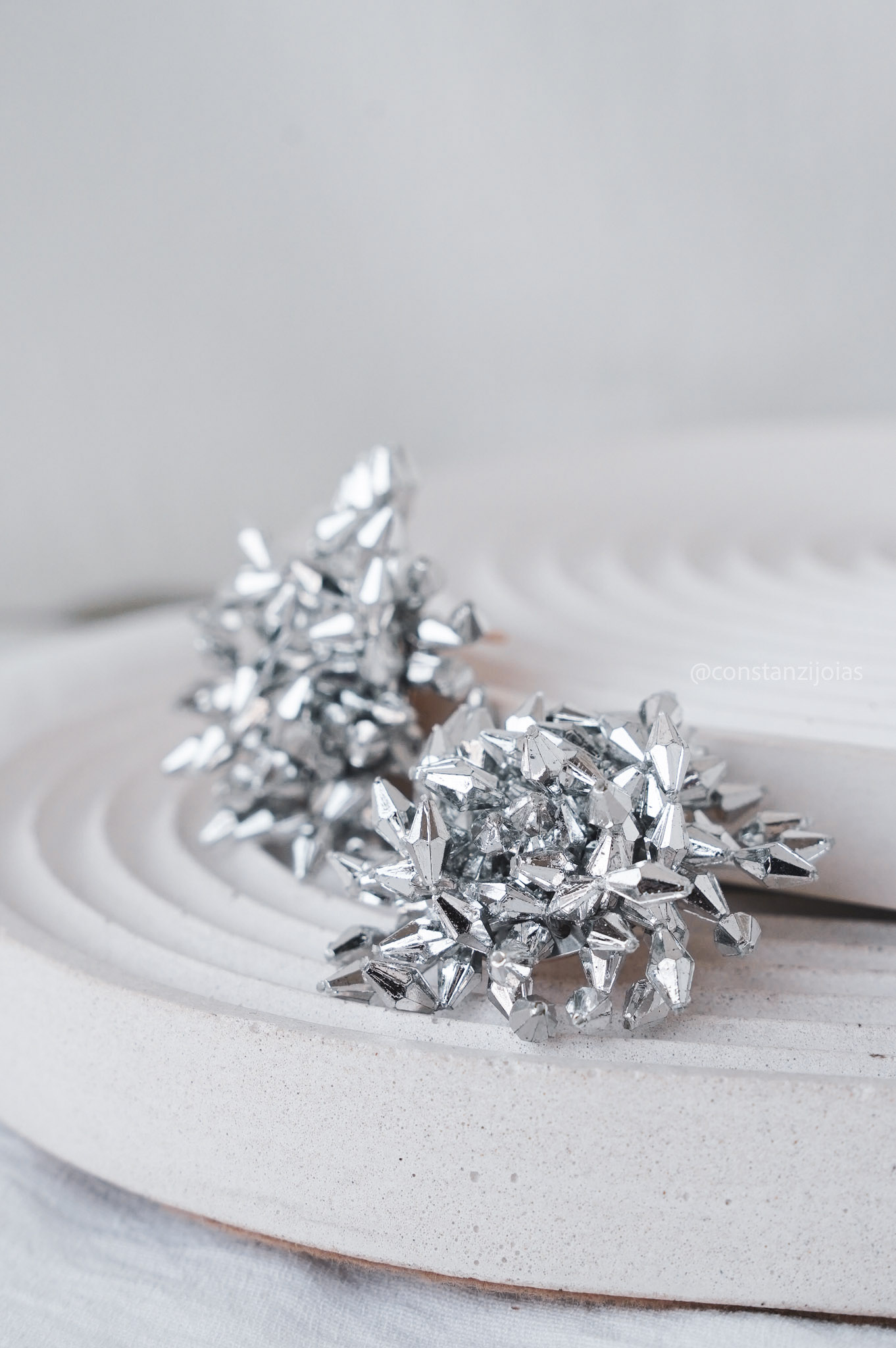O Brinco Ice impressiona pelo brilho intenso e pelo visual cristalizado em tom prata. Seu design volumoso lembra pequenos cristais de gelo agrupados, criando um efeito cheio de personalidade e glamour. A estrutura possui leve flexibilidade graças ao fio de nylon interno, proporcionando movimento natural e conforto, mesmo sendo uma peça de presença marcante.