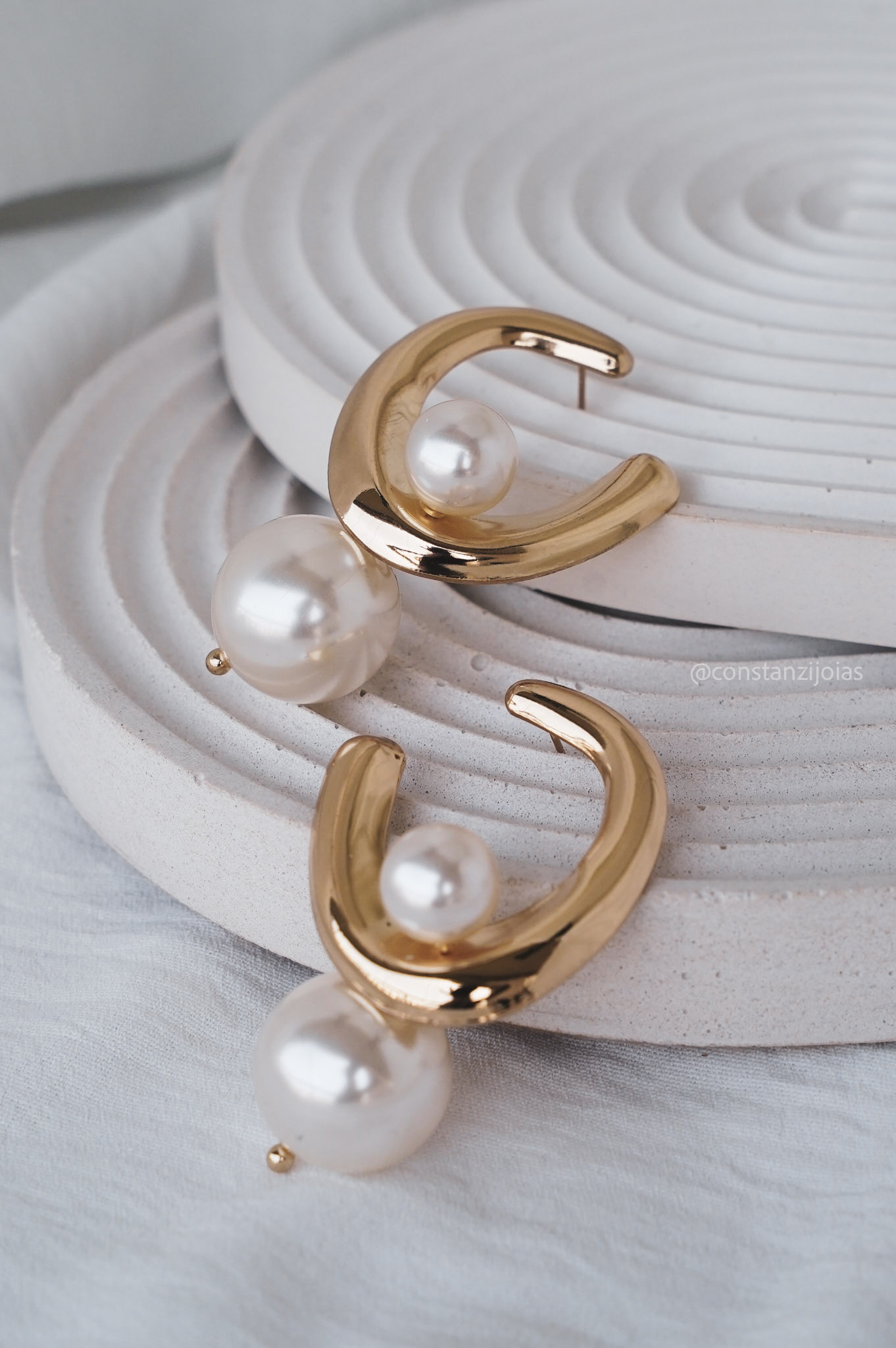Cada lado possui duas pérolas sintéticas, uma menor e outra maior, estrategicamente posicionadas para criar profundidade, brilho e suavidade ao look. O banho flash dourado realça o design escultural da argola, trazendo luminosidade e acabamento refinado à bijuteria fina.