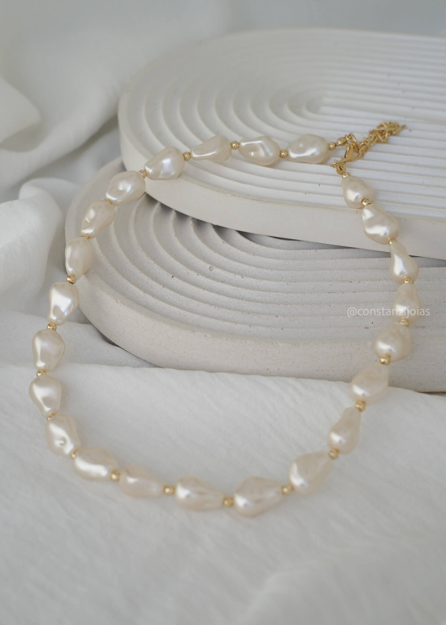 O Colar Ariel combina delicadeza e sofisticação em um design clássico e versátil. Composto por pérolas barrocas sintéticas intercaladas com pequenas esferas douradas, ele traz um toque moderno e refinado que eleva qualquer produção, do casual ao elegante.