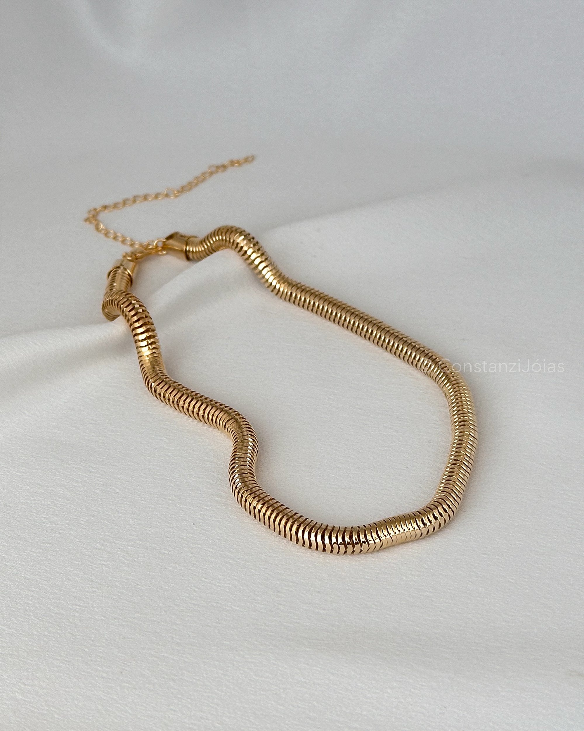 O Colar Big Snake apresenta um design elegante e sofisticado de snake / rabo de gato, sendo uma malha de metal com Banho Flash Dourado / Bijouteria Fina. Pode ser combinado com outros colares e acessórios, formando um mix para valorizar sua produção.