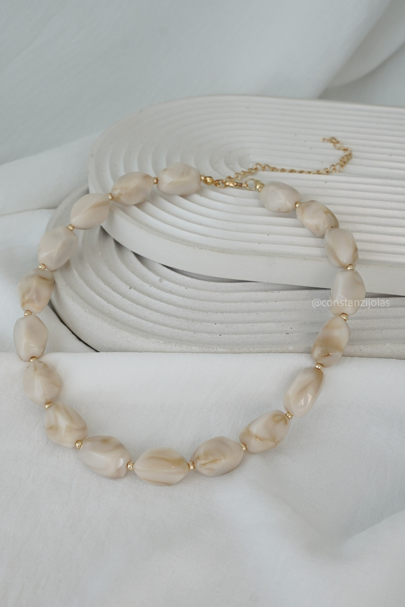 O Colar Brisa traduz leveza e sofisticação em um design atemporal. Composto por pedras em tom claro com efeito marmorizado suave, a peça traz uma estética delicada e natural, perfeita para iluminar o visual com elegância discreta e charme orgânico.