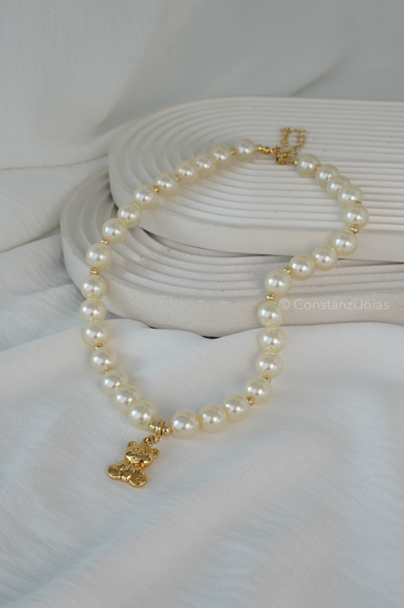 O Colar de Pérolas Teddy traz delicadeza e um toque lúdico em um design encantador e sofisticado. Composto por pérolas clássicas intercaladas com pequenas esferas douradas, ele ganha destaque com um pingente de ursinho (teddy) na cor dourada, adicionando personalidade e charme à peça.