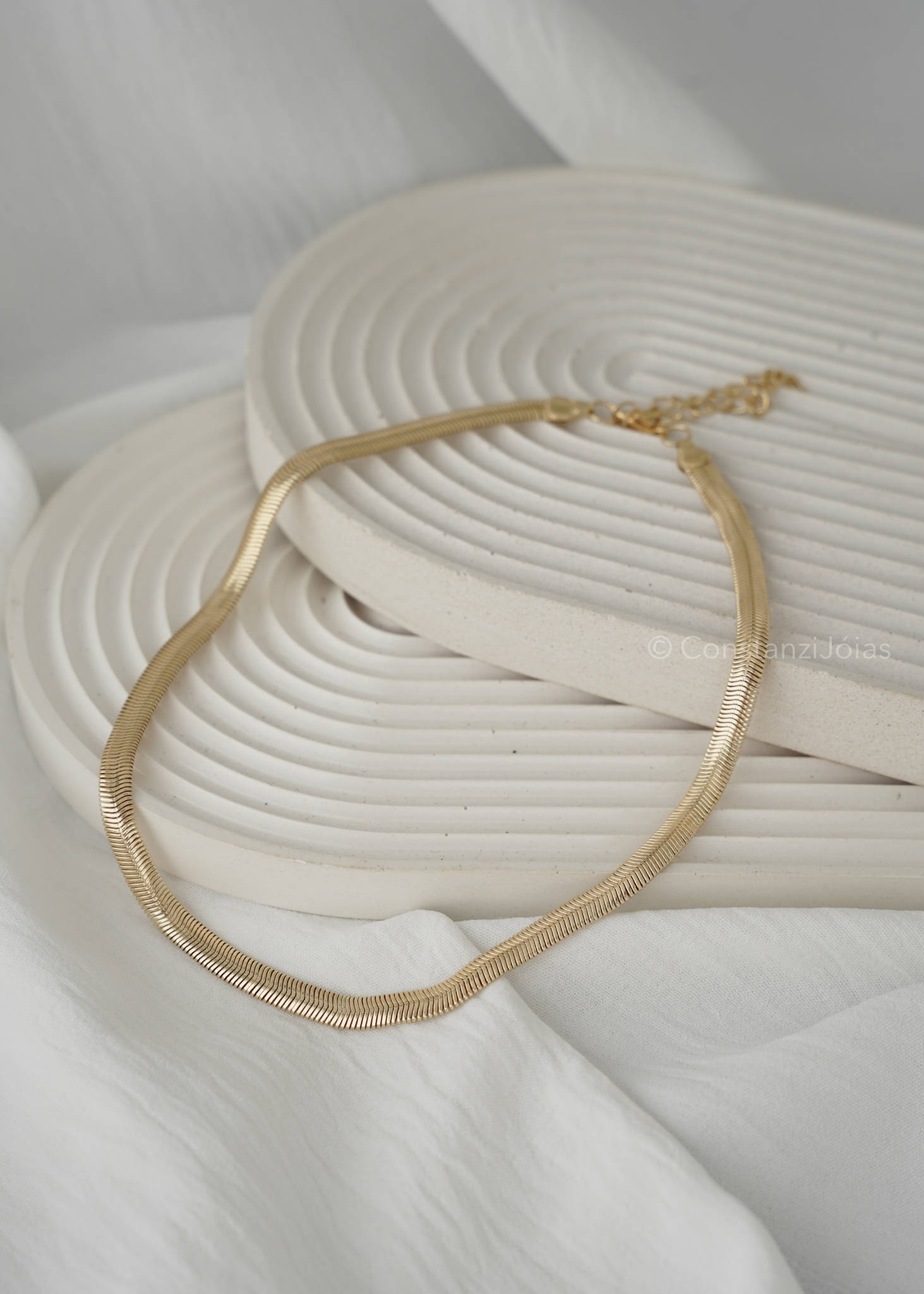 Confeccionado em bijuteria fina com banho flash dourado, possui malha larga e estrutura maleável, proporcionando um caimento perfeito e confortável. Um colar versátil, que pode ser usado sozinho como destaque do look ou combinado com outros acessórios para composições marcantes.