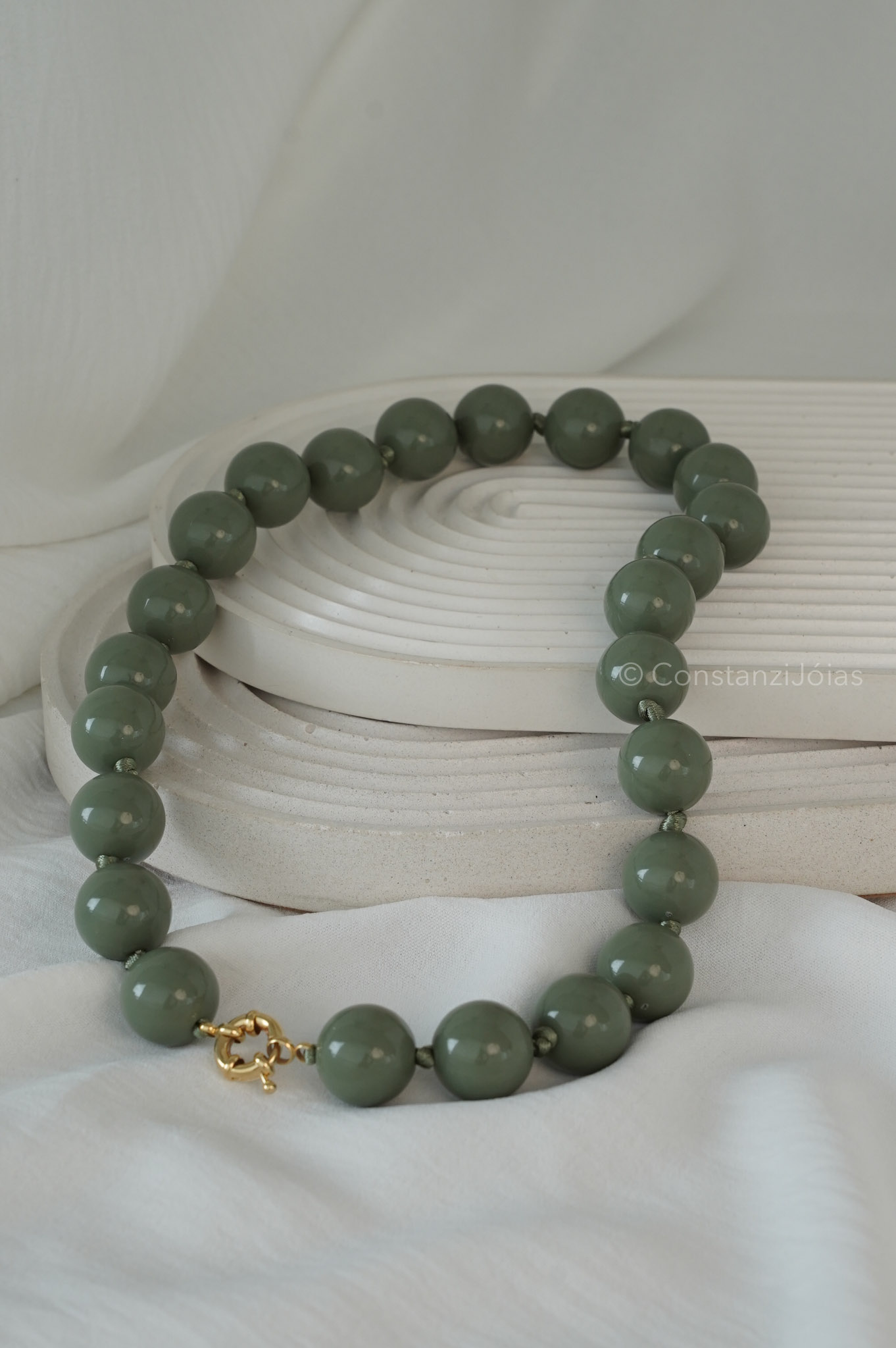 O Colar Oliva traz elegância e personalidade em um design sofisticado com esferas na cor verde, inspiradas na natureza. Seu visual marcante é complementado pelo fecho boia dourado, que além de funcional, se torna um detalhe de estilo, podendo ser usado tanto na parte frontal como um ponto de destaque quanto na parte de trás do pescoço.