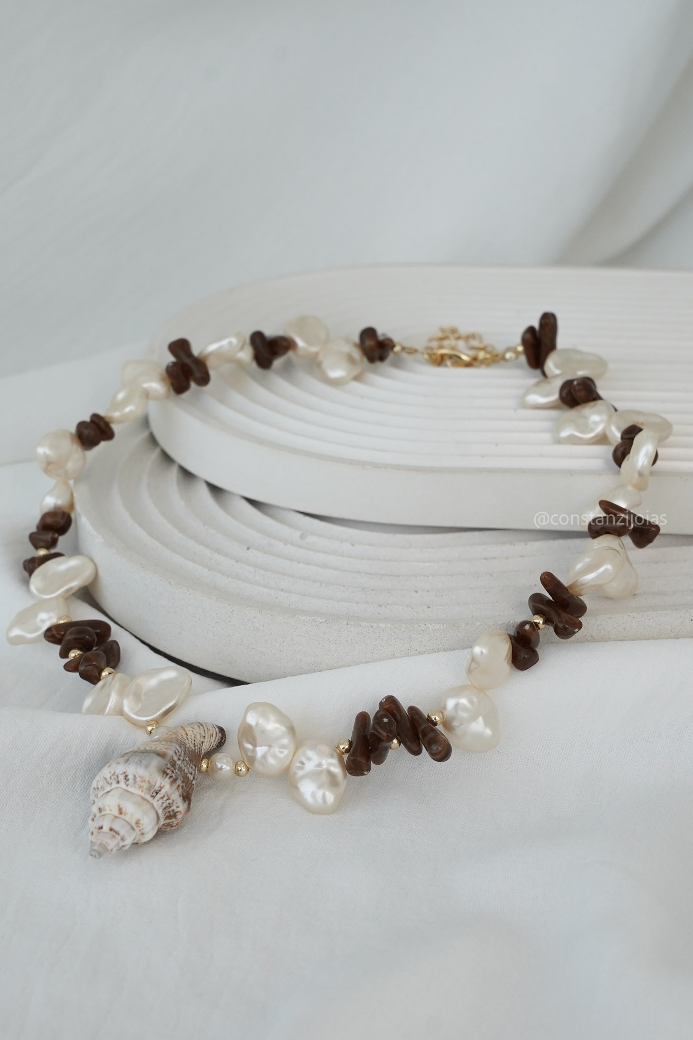 ✔ Design orgânico com pedras claras, marrons e pérolas irregulares